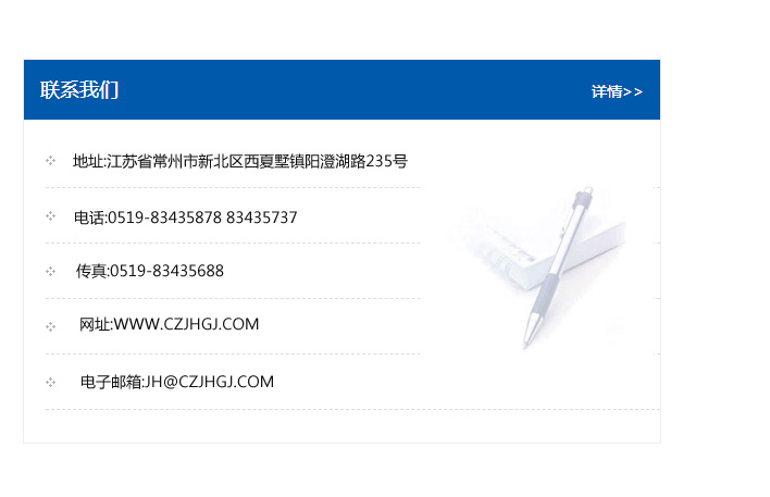 傳真:0519-83435688    郵編:213135    網址:WWW.czjhgj_com.xxzhongke.com    電子郵箱:JH@czjhgj_com.xxzhongke.com